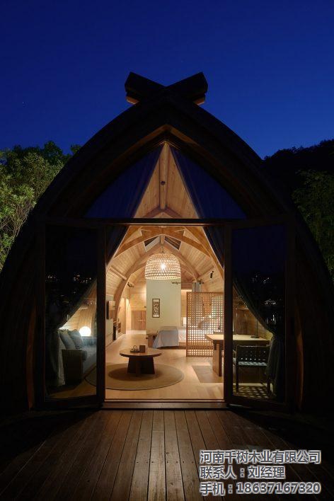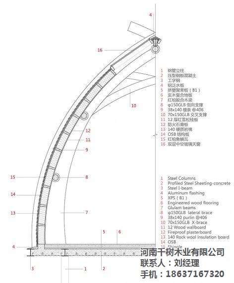 拱形的船身結(jié)構(gòu),由四組三鉸拱木拱梁通過五根圓木連接為整體,每組三鉸拱由左右兩個對稱半拱吊裝拼接,而每個半拱又由兩道十一公分寬的北美花旗松膠合拱梁組合成,拱頂?shù)男〗徊嬲鎸嵎磻?yīng)拱結(jié)構(gòu)的對接特征。采用三鉸拱的形式,避免了木材因過度彎曲而產(chǎn)生超限的應(yīng)力。整個屋面系統(tǒng)保持在拱梁的厚度之中,內(nèi)部紅雪松掛板使用水性清漆保持原木紋理和觸感,外部使用了三種尺寸的紅雪松木瓦上下微錯的鋪裝方式,質(zhì)感自然。