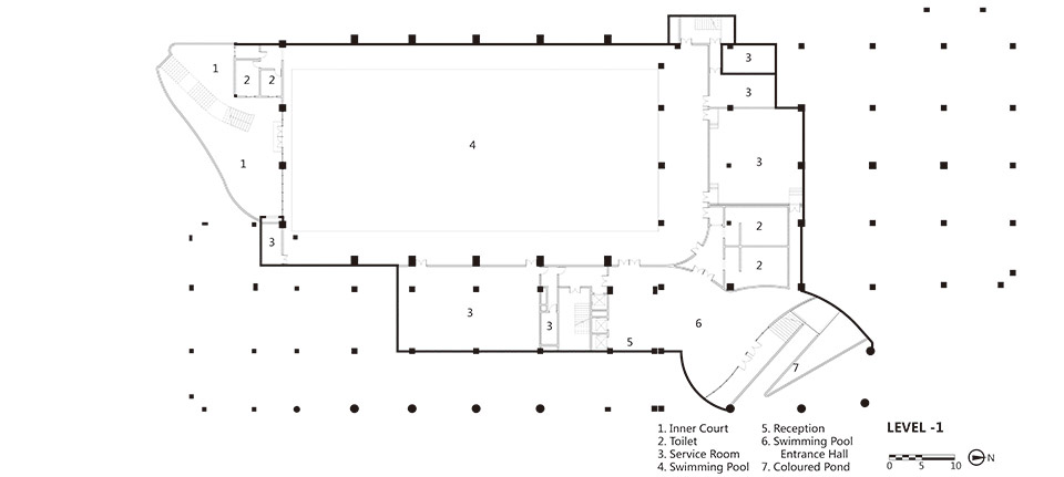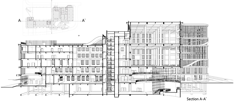 我們希望通過這個項目喚起我們的父輩及下一代的歸宿感。農業(yè)生產是那個時代“集體式生活”的標志,自然地貌便是這一代人集體記憶的背景。我們通過對建筑空間在“地面”層面上的疊加,再現(xiàn)了自然地貌:在城市層面上,由于本項目地處城市擴張的邊界,位于較低的洼地地形,面鄰一個保留的綠化高地,我們在建筑手法上引入一系列上下錯開的水平樓板來使這兩種極端的地貌形成空間上的對話;在建筑尺度,我們轉譯了這種拓撲關系為一種多層樓板的空間類型,例如地下室空間轉折到首層入口層,接著又垂直延伸到二層空間,并不斷交錯向上;在細部層面,我們使用了木紋鋁方通遮陽板系統(tǒng)將豐富的地景引入到室內,是對本土的竹材結構建筑形制所做出的回應。