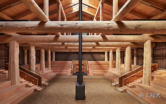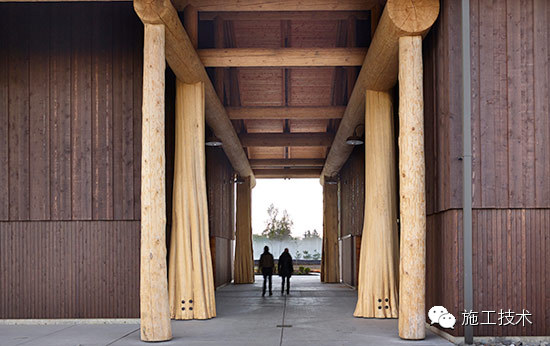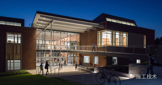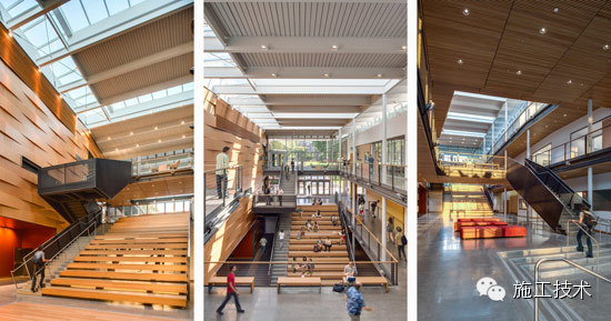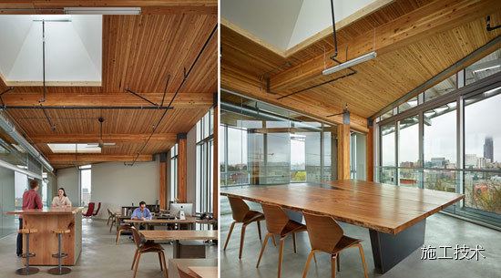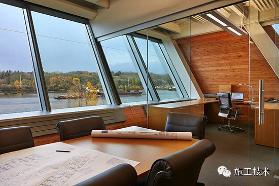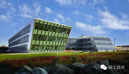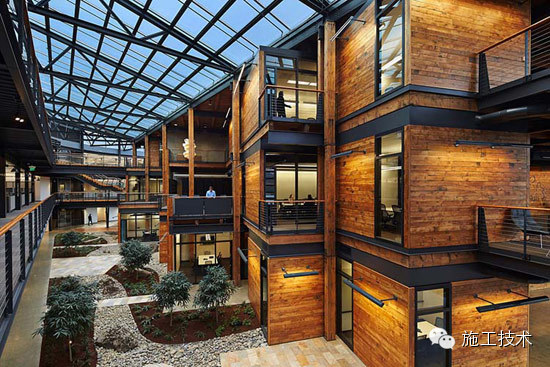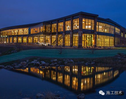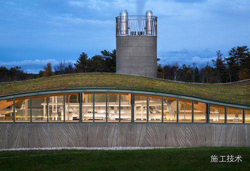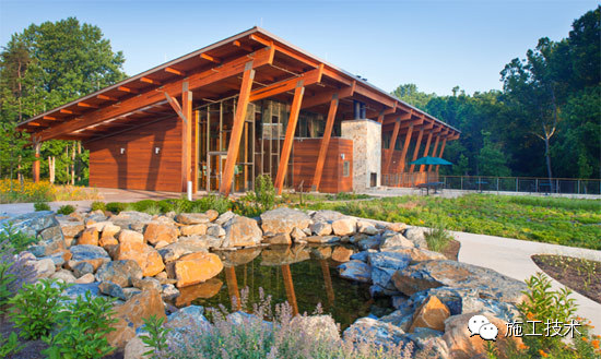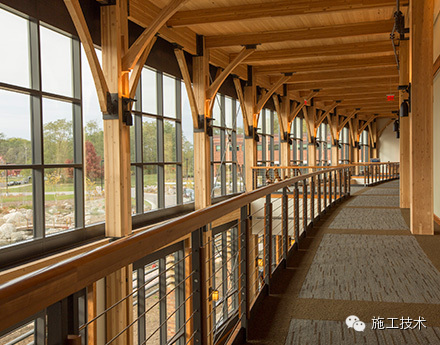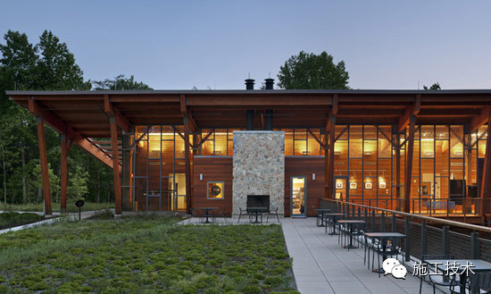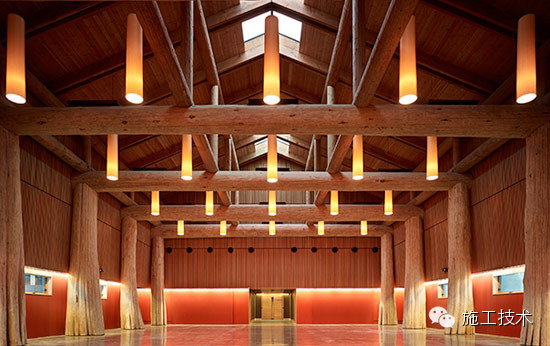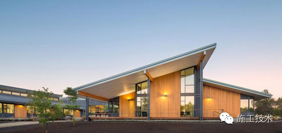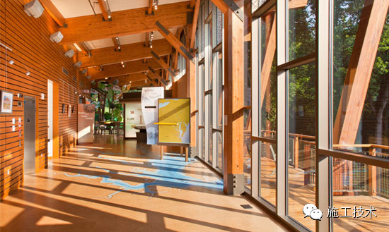 建筑物的桁架為膠合層壓板,從而優(yōu)化了這種可再生資源的結(jié)構(gòu)價(jià)值。膠合板消耗能源少于鋼筋混凝土或鋼材,可用于更長(zhǎng)的時(shí)間跨度,可承受重負(fù)荷,并且擁有復(fù)雜 的形狀。該建筑通過了LEED環(huán)境保護(hù)認(rèn)證,包括一套可再生的膠合板結(jié)構(gòu)系、節(jié)水管道夾具、利用可回收的當(dāng)?shù)夭牧稀⑹覂?nèi)擁有豐富的自然光線以及高效的機(jī)械 系統(tǒng)、照明和外表皮。