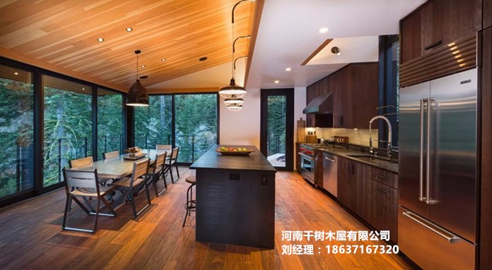 大的玻璃及原木結構,有室內外空間無縫過渡的感覺。木頭之美可能是想到木屋時想到的第一感覺。但寬闊的玻璃通常使木材更令人驚嘆。設計玻璃是一項重要的關鍵之處,設計師將考慮木屋的氣候,景觀以及陽光,風等。