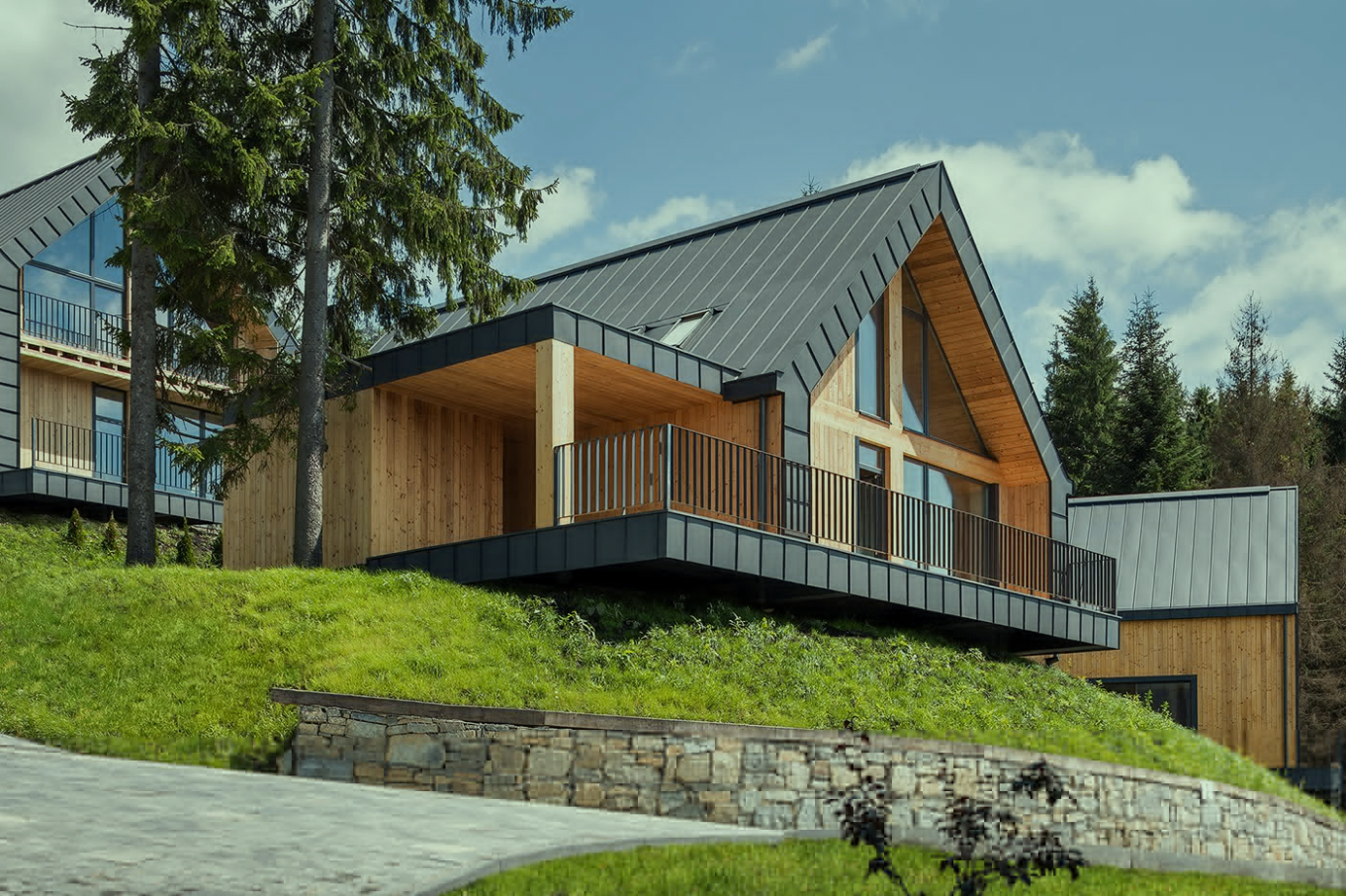 大面積窗戶:在木屋的設(shè)計中,采用大面積的窗戶設(shè)計,將周圍的自然美景引入室內(nèi)。這不僅可以讓居住者隨時欣賞到美景,還能增加室內(nèi)的采光和通風(fēng)效果。