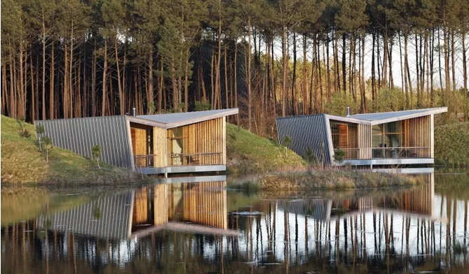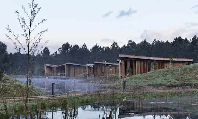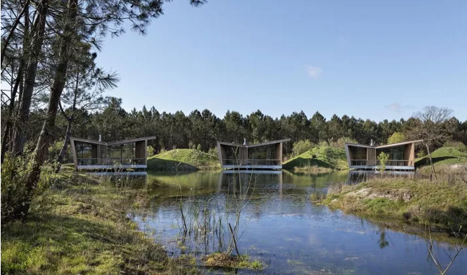 項(xiàng)目中所運(yùn)用的斜線,以及接待處微微傾斜的角度與后面的圓形沙丘和線性冠層形成鮮明的對比。建筑與環(huán)境之間的和諧關(guān)系不是建立在模仿的基礎(chǔ)上,而是由一種截然相反的同源性來定義的。這些小的、獨(dú)立的單位被安置在水面上,它們是景觀中的一個重要的節(jié)點(diǎn),與自然共同形成一個持續(xù)的有機(jī)環(huán)境。不同的路徑在山之間蜿蜒盤旋,以基地上各種不同的視角,你可以清晰地感覺到它的真實(shí)性。