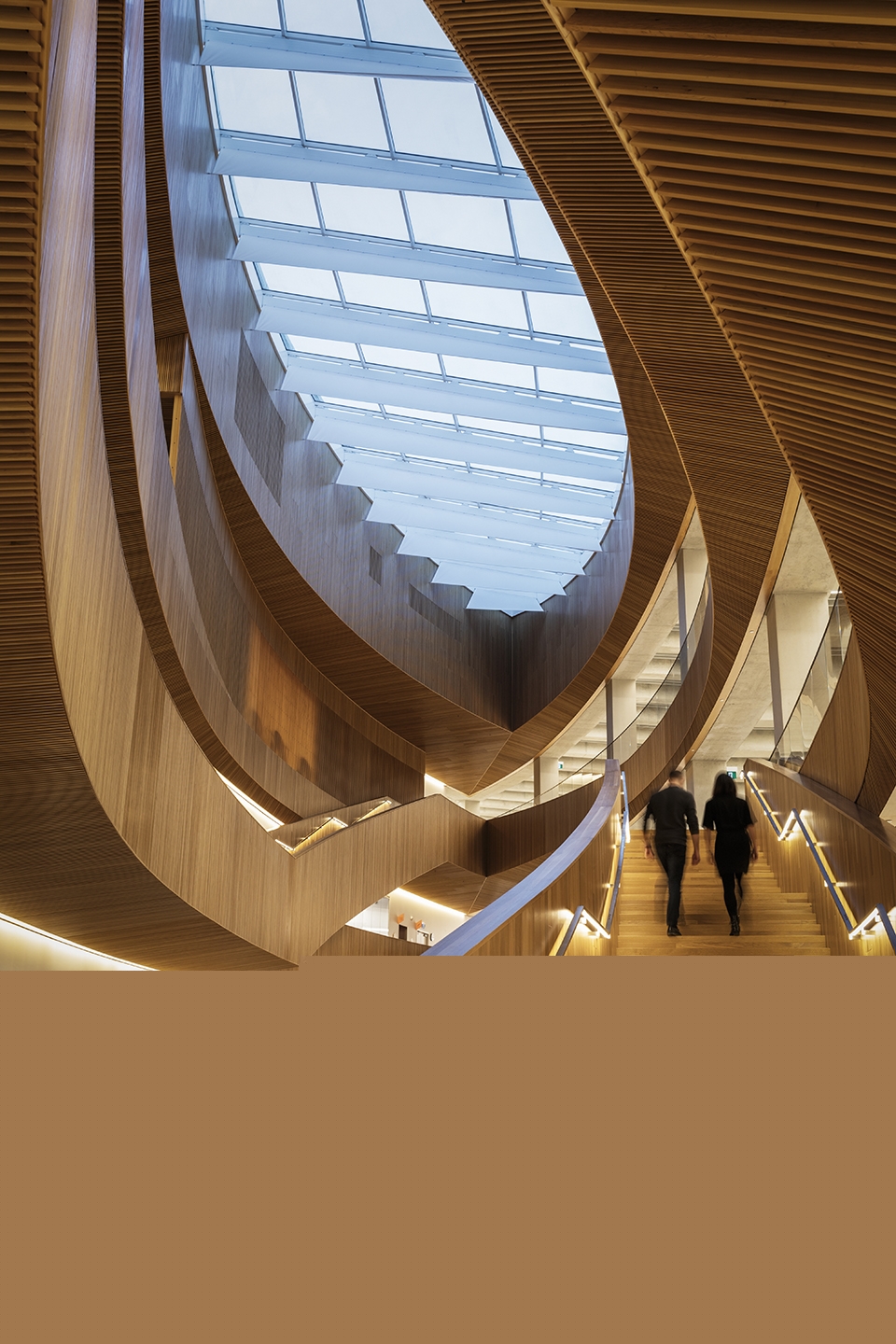 底層的外立面并未使用透明的六邊形,而是設(shè)計(jì)成了凹進(jìn)去的寬闊木質(zhì)拱頂,人們?cè)谶M(jìn)入圖書館的時(shí)候會(huì)產(chǎn)生被環(huán)抱的感覺。圖書館入口處結(jié)構(gòu)參考了當(dāng)?shù)爻R姷腃hinook云拱。入口處的雙曲面木質(zhì)拱廊是世界上最大的自由曲面木質(zhì)外殼之一,材質(zhì)選用了不列顛哥倫比亞省西部產(chǎn)的紅杉木。其有機(jī)形態(tài)和質(zhì)感讓大型建筑的尺度變得親密。從圖書館外面就能看到中庭,仿佛在邀請(qǐng)人們進(jìn)入。
