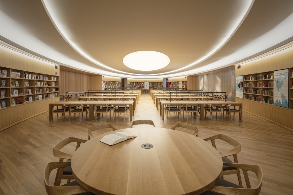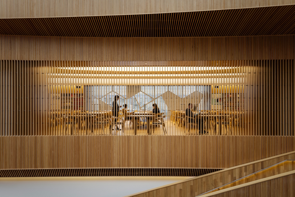 圖書館共有六層,分布著各種空間,比如數(shù)字空間,模擬空間,群體空間以及個(gè)人互動(dòng)空間。圖書館頂層是大閱覽室,建筑師在設(shè)計(jì)時(shí),把它構(gòu)想成藏在圖書館的珠寶盒,人們可以在這兒潛心研究,尋找靈感。進(jìn)入大閱覽室之前要先經(jīng)過一個(gè)過渡空間,過渡空間光線柔和,聲效優(yōu)良。室內(nèi)利用木質(zhì)格柵而非實(shí)體墻壁來環(huán)繞空間,這樣既保證了隱私,又有一定的可見度。陽(yáng)光透過木條的縫隙照亮了中庭和西立面之間的空間。