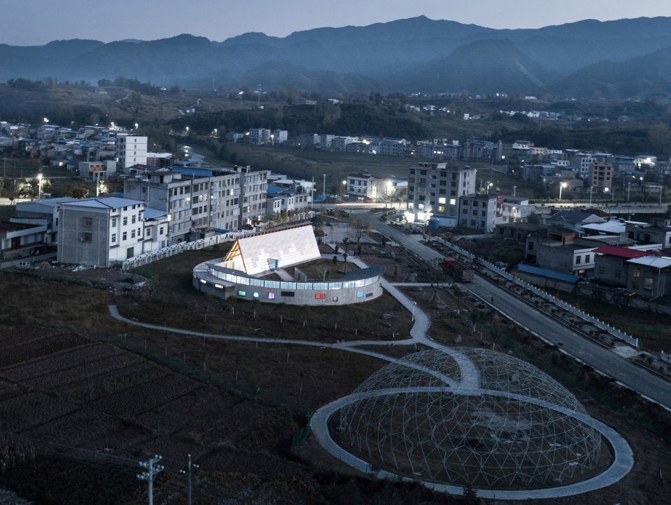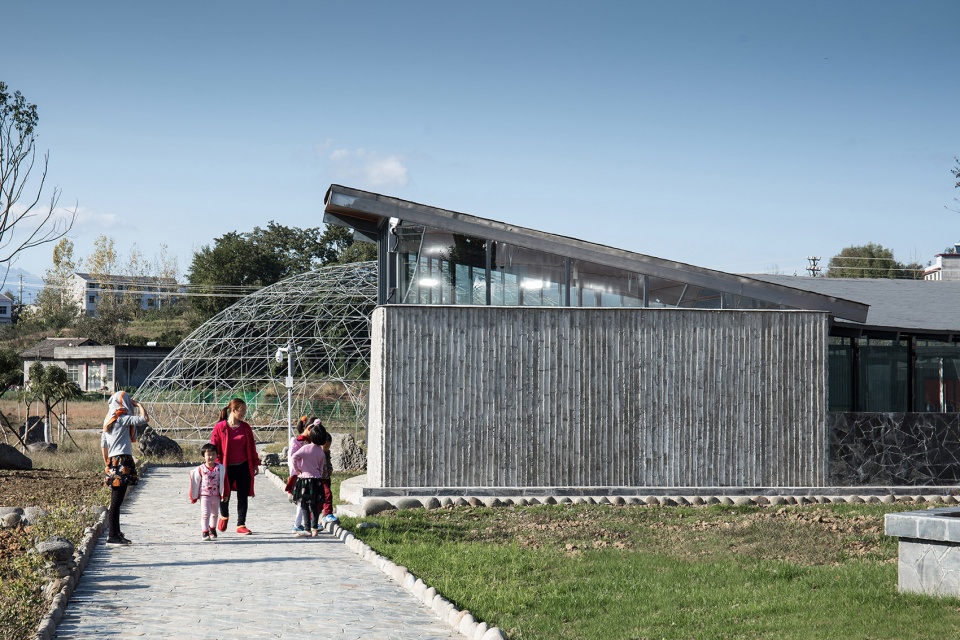 建筑需要面對新的長龍大道,也需要對新老路的轉(zhuǎn)角空間進行回應。墻體遇到親子活動的部分,折疊成弧形空間,包裹出其所需的室內(nèi)外場所;而在接待的部分,墻體則流動成線性空間,如巷道般通向村口,作為視覺和功能的導引,其正面又剛好圍合出面對長龍大道的入口場地,同時,巷道的另一個出入口也自然融入到親子活動的路徑上。