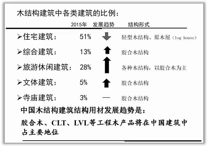 幾十年來,磚混結(jié)構(gòu)已廣泛應用于我們的民用建筑中。施工成本低,給人以安全感,耐用性和低維護成本,而木結(jié)構(gòu)房屋不穩(wěn)定,不安全,易著火,易受害蟲害。遇水分會導致腐爛和霉變,因此難以接受這種新的木結(jié)構(gòu)建筑。由于對現(xiàn)代木結(jié)構(gòu)的理解不足,因而產(chǎn)生這些疑問是正常的。只要在成本,安全,保護,功能等方面采取適當措施,通過大量的實驗比較,專業(yè)知識的宣傳,樣板房的示范,特別是中國古代木結(jié)構(gòu)建筑和文化的影響,我相信人們的思想會發(fā)生變化,而木結(jié)構(gòu)建筑的生活體驗也會影響人們的固有觀念?,F(xiàn)代木結(jié)構(gòu)完全可以被接受。下圖所示的各類木結(jié)構(gòu)建筑發(fā)展趨勢也能說明這一點。