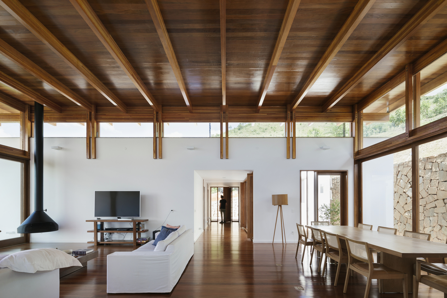 在中庭中,外部與內(nèi)部的聯(lián)系逐漸增強(qiáng),結(jié)構(gòu)從其他房間生長(zhǎng)出的遮蓋構(gòu)件亦如是。磚石平面中吸引人的木質(zhì)細(xì)部,除了能夠儲(chǔ)存建造過(guò)程的記憶,反應(yīng)混凝土柱的支撐桿以外,還可以將光線引入入口,以及增強(qiáng)對(duì)外部空間的感知。其中的空間,從最外部到最內(nèi)部,采用了方形的外觀。幾乎全部的外部空間,幾乎全部的內(nèi)部空間。光線,空氣,人群以及景觀互相互動(dòng)。