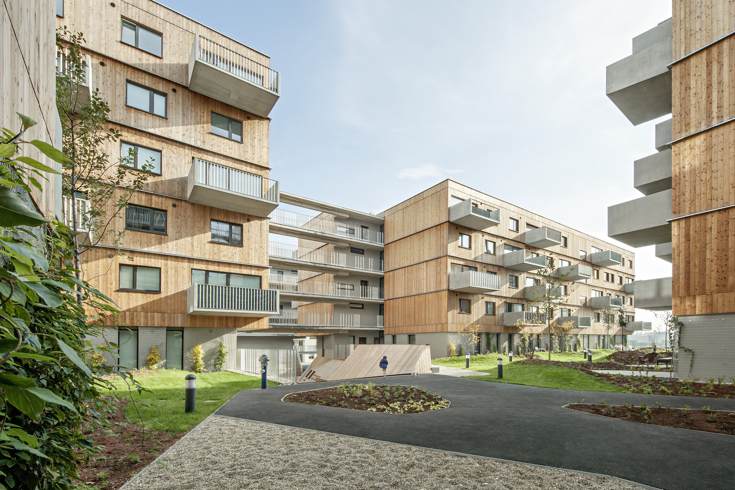 位于Seestadt Aspern東南部的大型建筑地塊D12,是一系列建筑體量相似,但規(guī)模不同的建筑。該建筑群共有213套公寓和8個商店,是由一組清晰可辨的獨立木制房屋組成,其形式為細(xì)長、緊湊的獨立體量。錯落有致的布局創(chuàng)造了不同類型的庭院式空間和各種視覺關(guān)系。