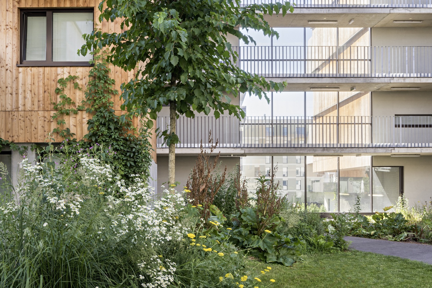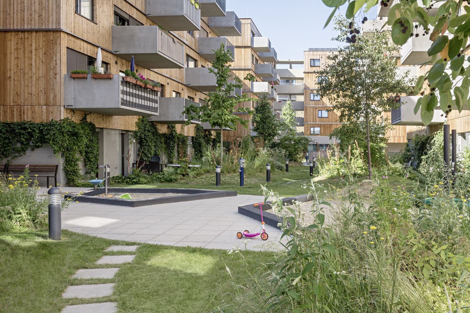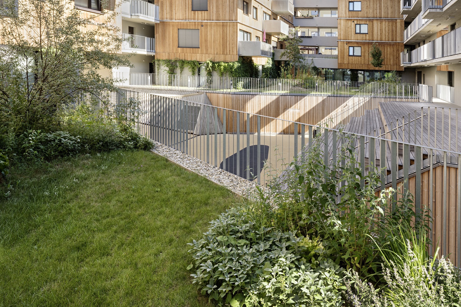 綠色的庭院與一些長滿青草的小山丘一起,形成了一個有機(jī)的景觀,這些庭院的翼形梯田有意地凸顯在中央庭院的中間。山丘、樹木和帶小樹冠的灌木遮擋了私人露臺。通往丘陵景觀的道路網(wǎng)絡(luò)被刻意限制,以防止走廊式路線的發(fā)展。在入口區(qū)、洗衣房和兒童游樂場前的路口形成了聚會場所。