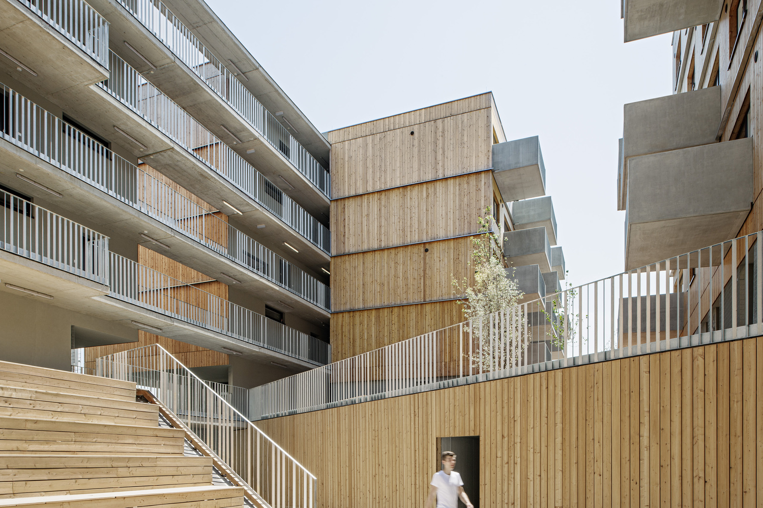 各個部分通過三排南北方向的通道平臺相互連接。這三條流通路線通過一系列采光樓梯、內(nèi)部走廊和開放的通道平臺,提供了不同的空間體驗。串行的線性基本結(jié)構(gòu)為布置不同類型的公寓提供了極大的靈活性,因此允許居民的交流。公寓平面圖的設(shè)計非常靈活。它們可以在以后以各種方式改變。盡管它們有一個很好的能源平衡,但建筑仍然向外開放。結(jié)合使用木材作為建筑材料,使整個建筑群既輕盈又有深度。