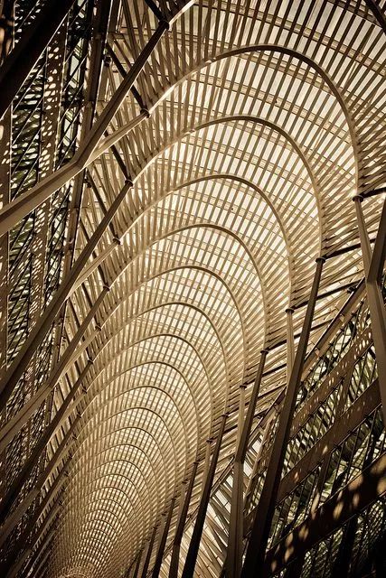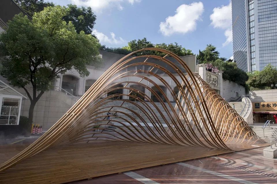 為了達(dá)到更輕薄的形體效果,建筑主體采用竹鋼搭建,豎向的立柱每根都為承重住,從而達(dá)到均勻受力的效果。“柱”與“梁”的連接部分采用簡(jiǎn)單的交錯(cuò)堆疊起來(lái)進(jìn)行構(gòu)造的方法,使其在形式上產(chǎn)生出類似斗拱結(jié)構(gòu)的效果。
