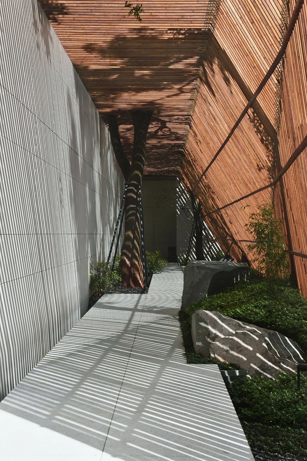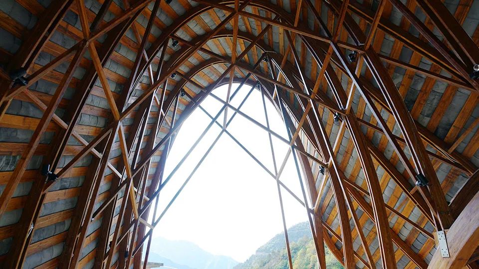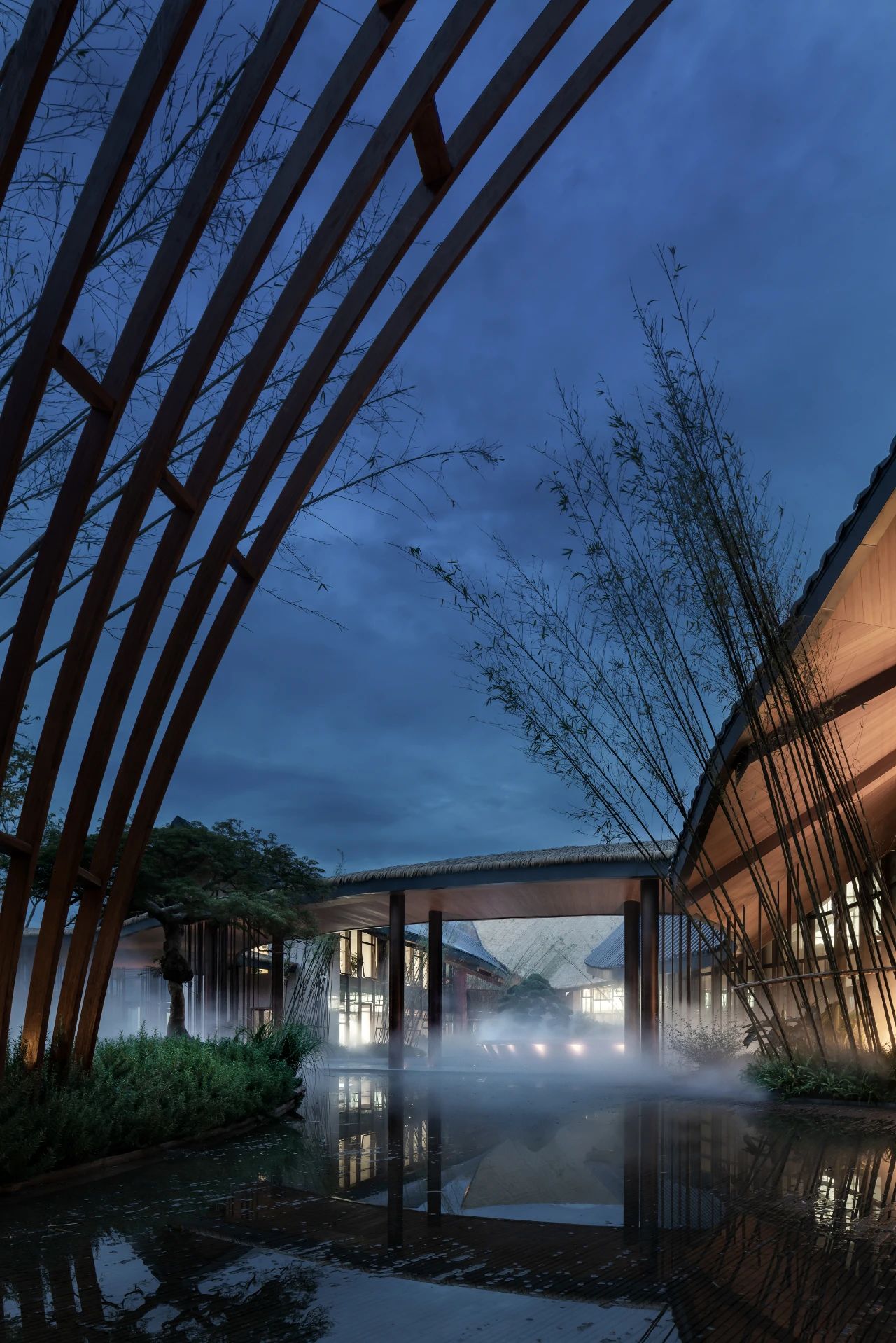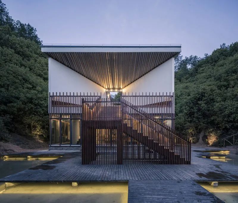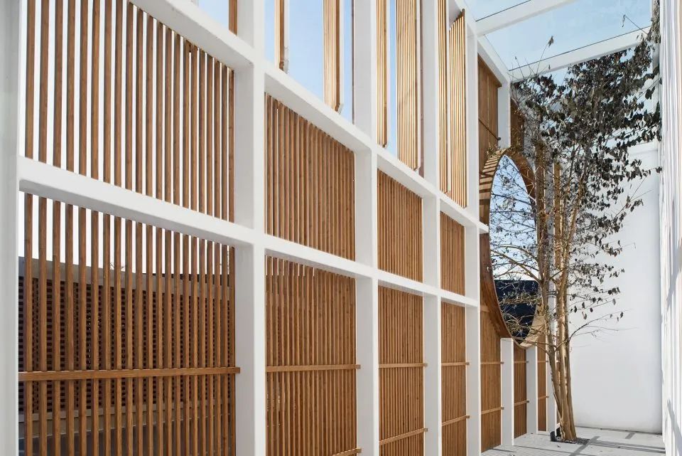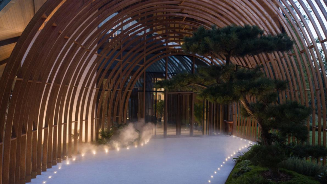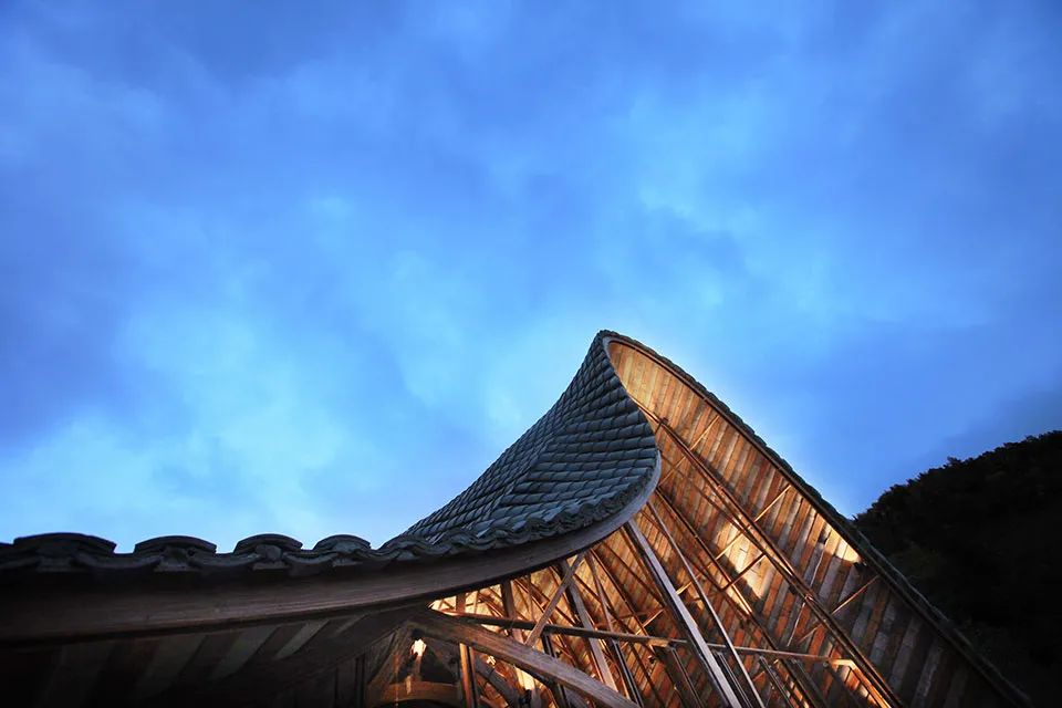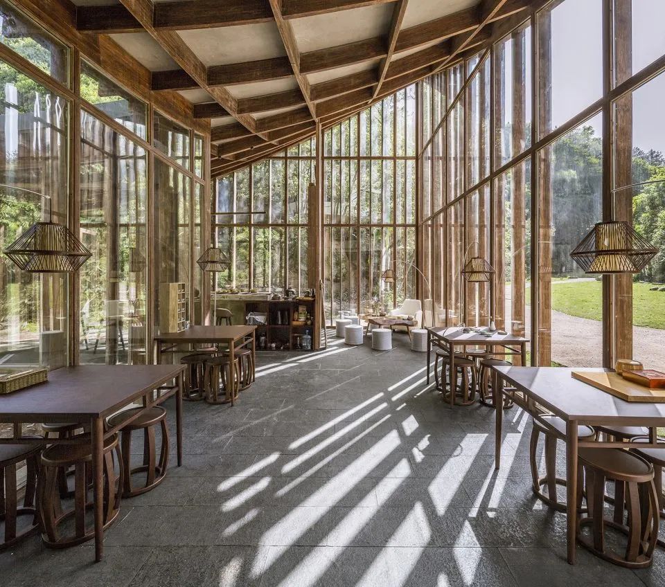 曲面屋頂聯(lián)系起整個(gè)建筑群落,豎向的桿件結(jié)合曲面屋面,組成自由、輕盈的建筑形態(tài),取材延續(xù)中國(guó)古建筑的質(zhì)樸自然,借助青瓦、鋼木等,打造建筑的原始與本真,釋放出閑適愜意的空間氛圍。
