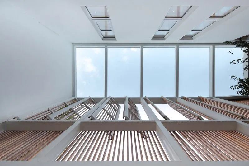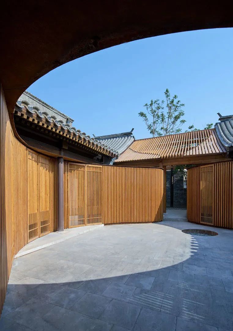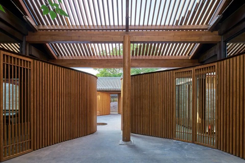 屋頂用原先木架尺寸的竹鋼梁架搭接,椽子采用十字交叉竹鋼構(gòu)件組合,在小院的正上方勾勒出葫蘆形的輪廓,通透的竹鋼板屋面一方面呼應(yīng)了原有屋瓦的尺度,又形成屋面中間更為通透的效果,給屋中小院引入充足的陽(yáng)光,便于樹(shù)木生長(zhǎng)。