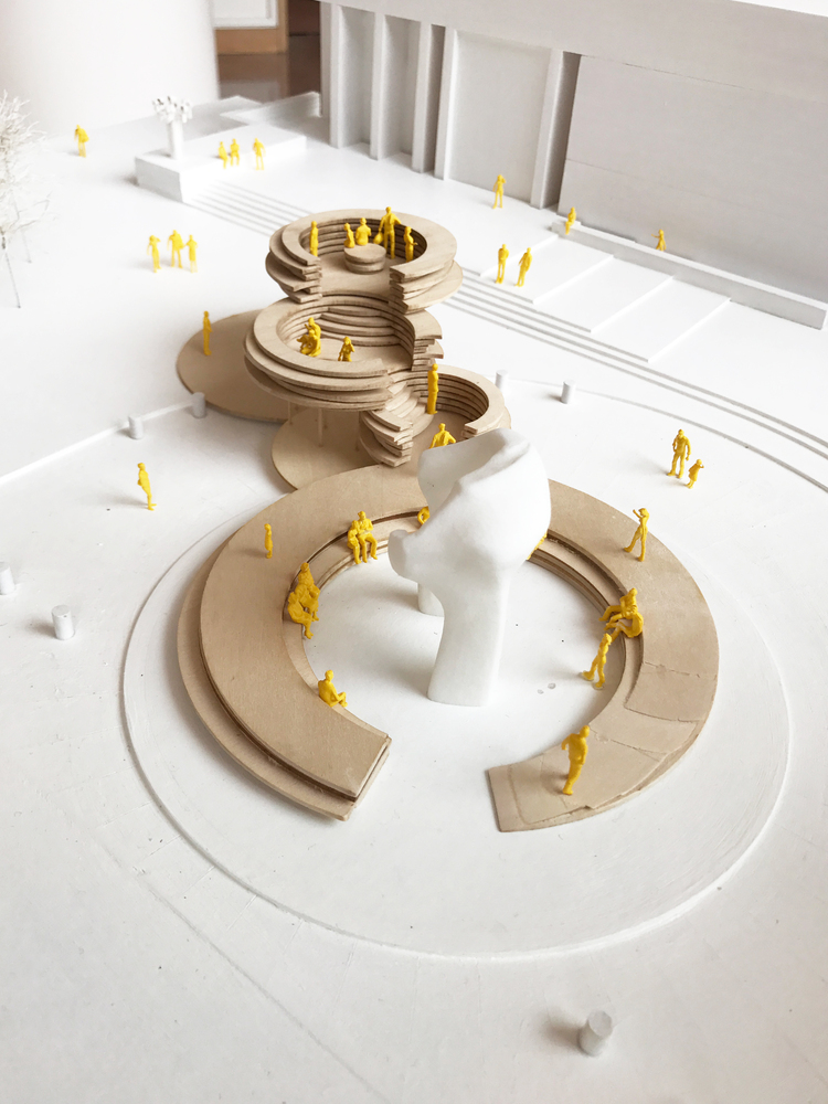 IKD給Cleo Rogers紀(jì)念圖書(shū)館廣場(chǎng)的設(shè)計(jì)方案,題目是對(duì)話基座 (Conversation Plinth),其目的是為了向 J Irwin Miller 致敬并慶祝哥倫布社區(qū)。它的形式是受 Miller House 談話的正廳的啟發(fā), 同時(shí)他的“基座”抬高并強(qiáng)調(diào)了場(chǎng)地周圍的重要地標(biāo)建筑-貝聿銘設(shè)計(jì)的圖書(shū)館,由薩里寧設(shè)計(jì)的第一個(gè)基督教堂,和亨利.摩爾設(shè)計(jì)的 Large Arch。