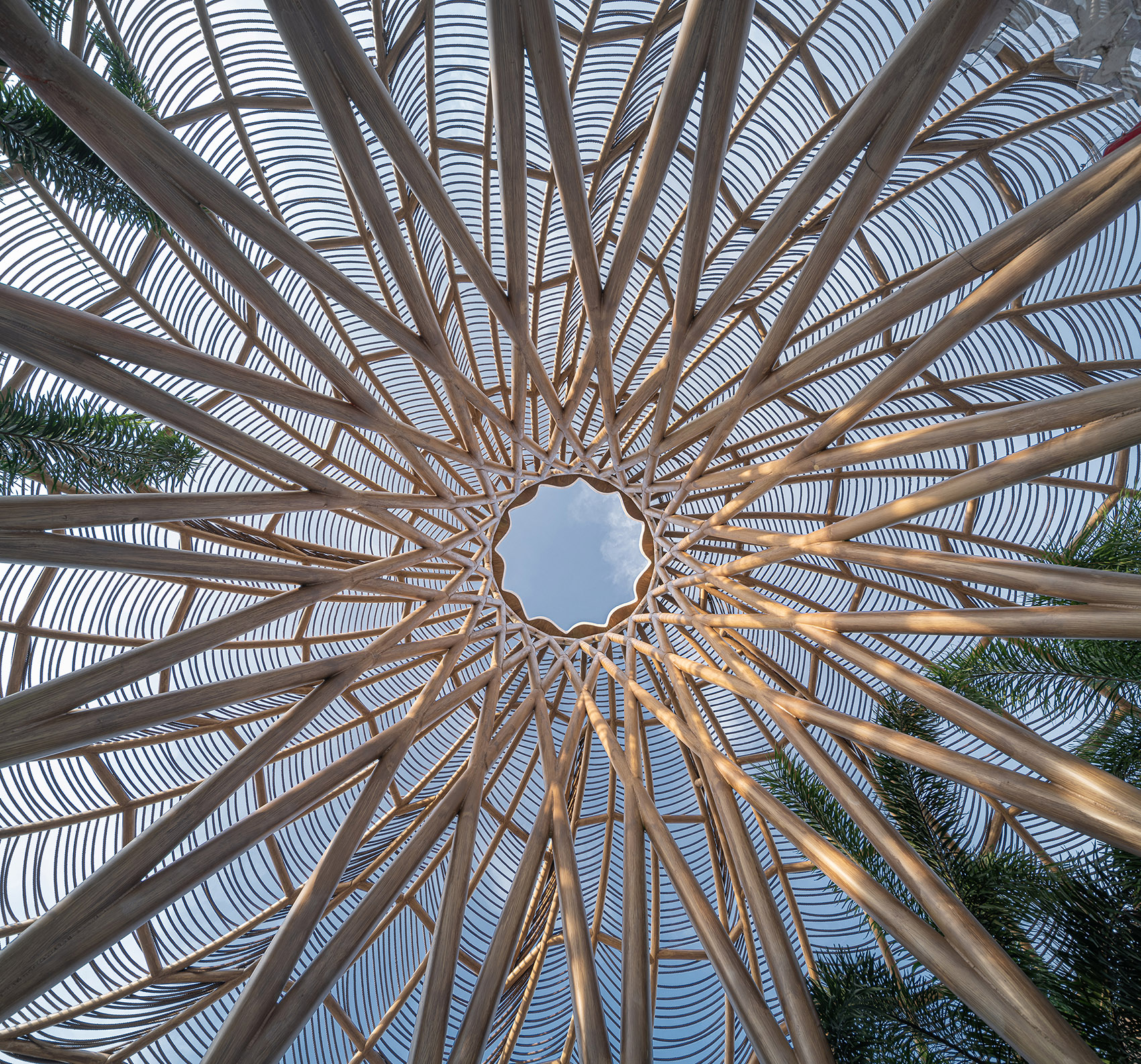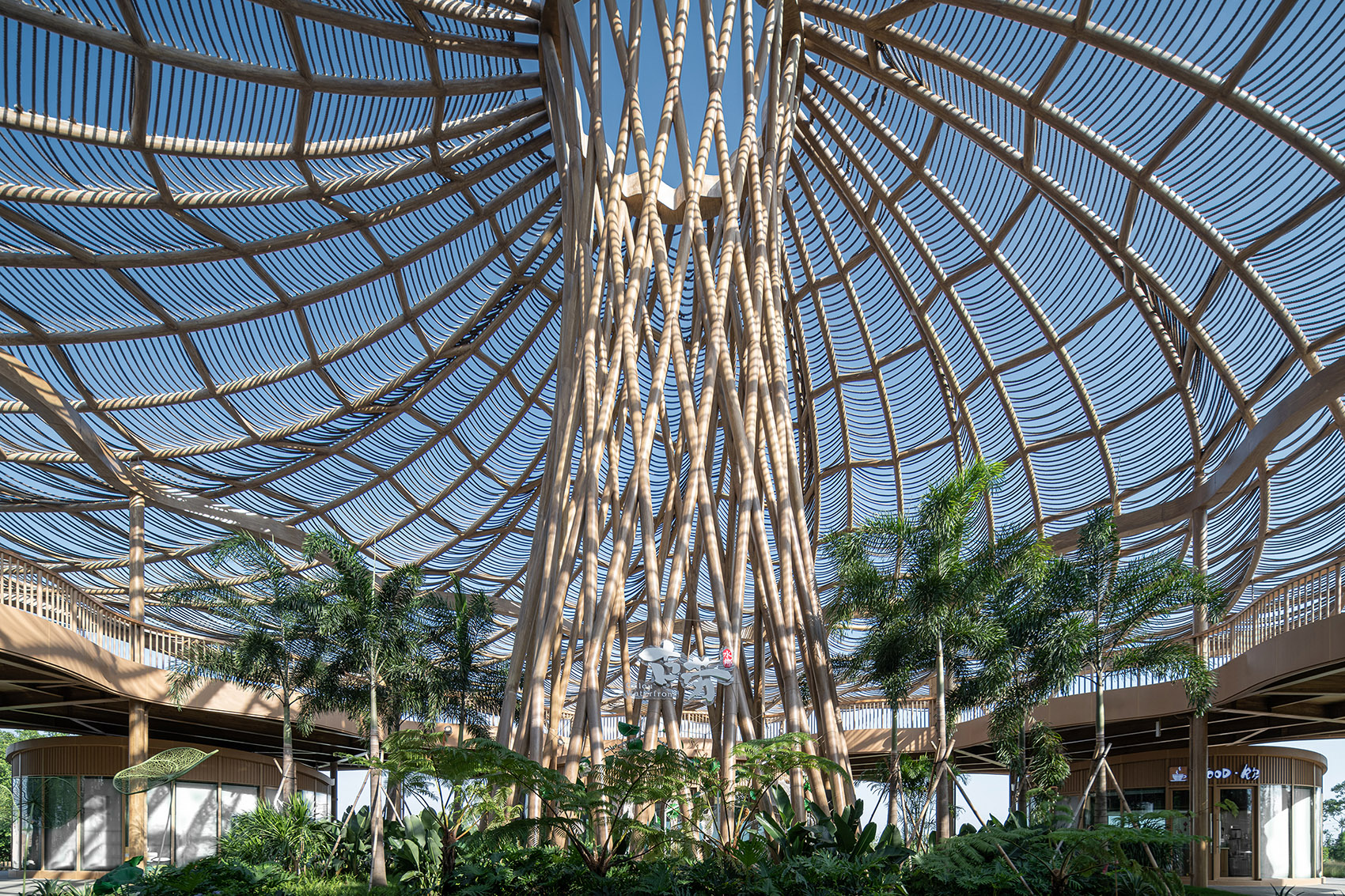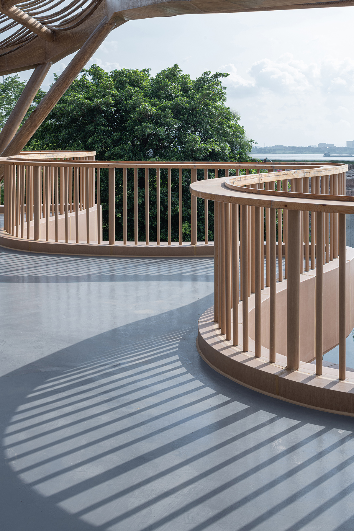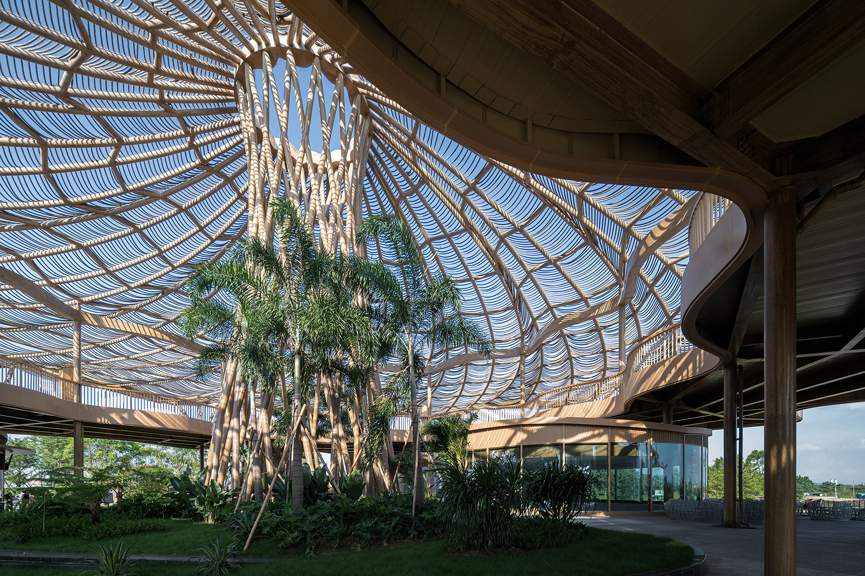 屋頂采用當(dāng)?shù)靥烊徊牧下槔K遮陽(yáng),在保證了整體建筑完整性的同時(shí),將地域生態(tài)的材料用現(xiàn)代懸掛的形式呈現(xiàn),提升了屋頂觀覽區(qū)的觀賞性,使整個(gè)建筑也成為了一道靚麗的風(fēng)景線。