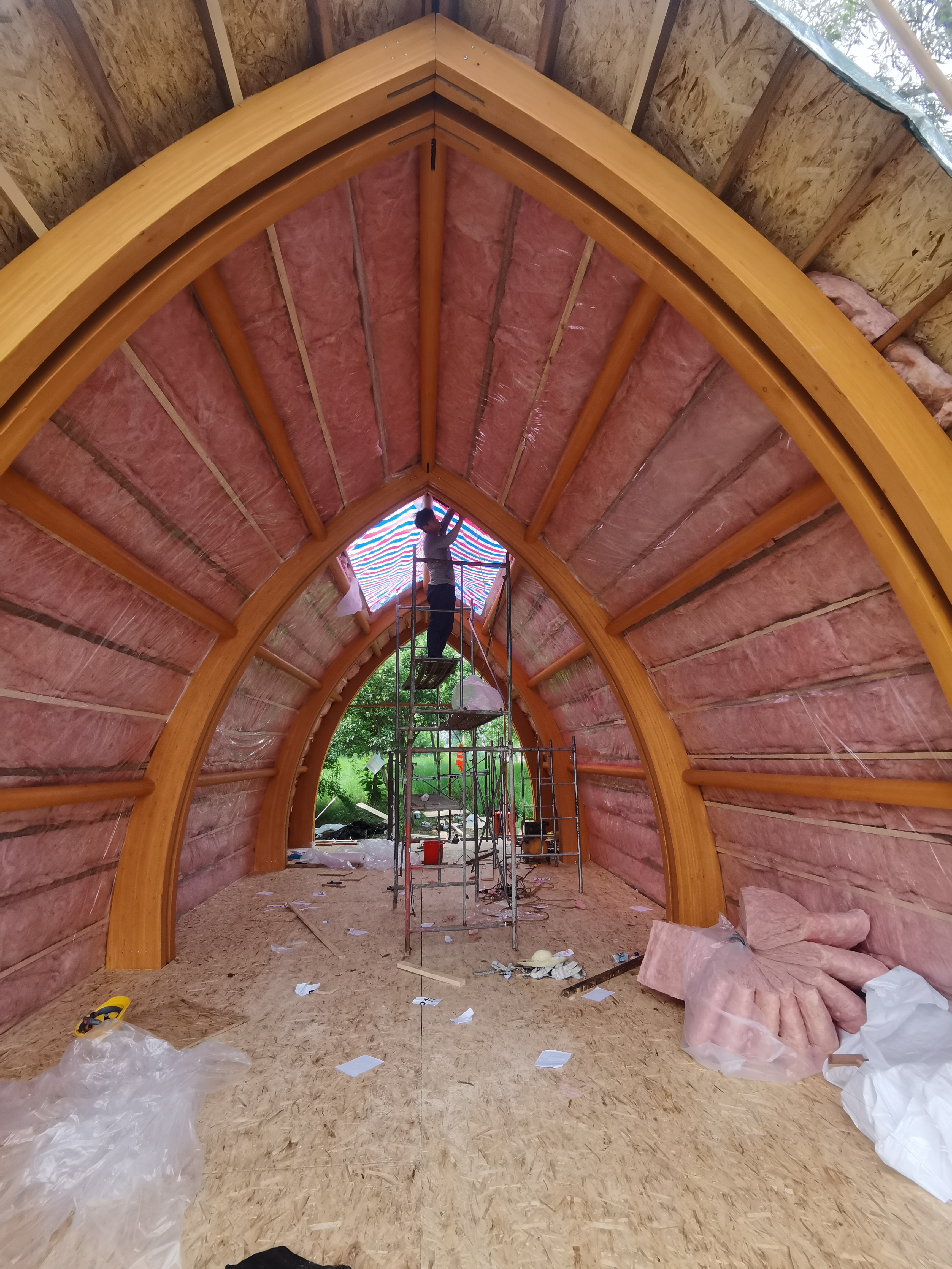 在木屋建筑的外墻應(yīng)安裝設(shè)計如呼吸紙等的防潮層,針對風(fēng)雨的侵襲能起到很好的抵抗作用。在墻體開口處的上方或是窗體下設(shè)置泛水,多風(fēng)雨的地方可以使用防雨幕墻系統(tǒng)進(jìn)行保護(hù)。外墻外飾面的施工應(yīng)在填充外墻保溫材料和室內(nèi)裝修完成前進(jìn)行,這樣能夠保證外界的潮氣不會進(jìn)入并滯留在墻體中的空隙,但這很大程度上將會受到工程進(jìn)度的影響。真正實施時,外墻裝飾的施工由于各種原因的限制將會晚于保溫材料和室內(nèi)裝飾的施工,但無論是那種情況,在填充保溫材料和安裝石膏板墻前一定要完成防潮層的施工,否則水分將會滯留于墻體空隙,造成木屋建筑的保溫性能降低。